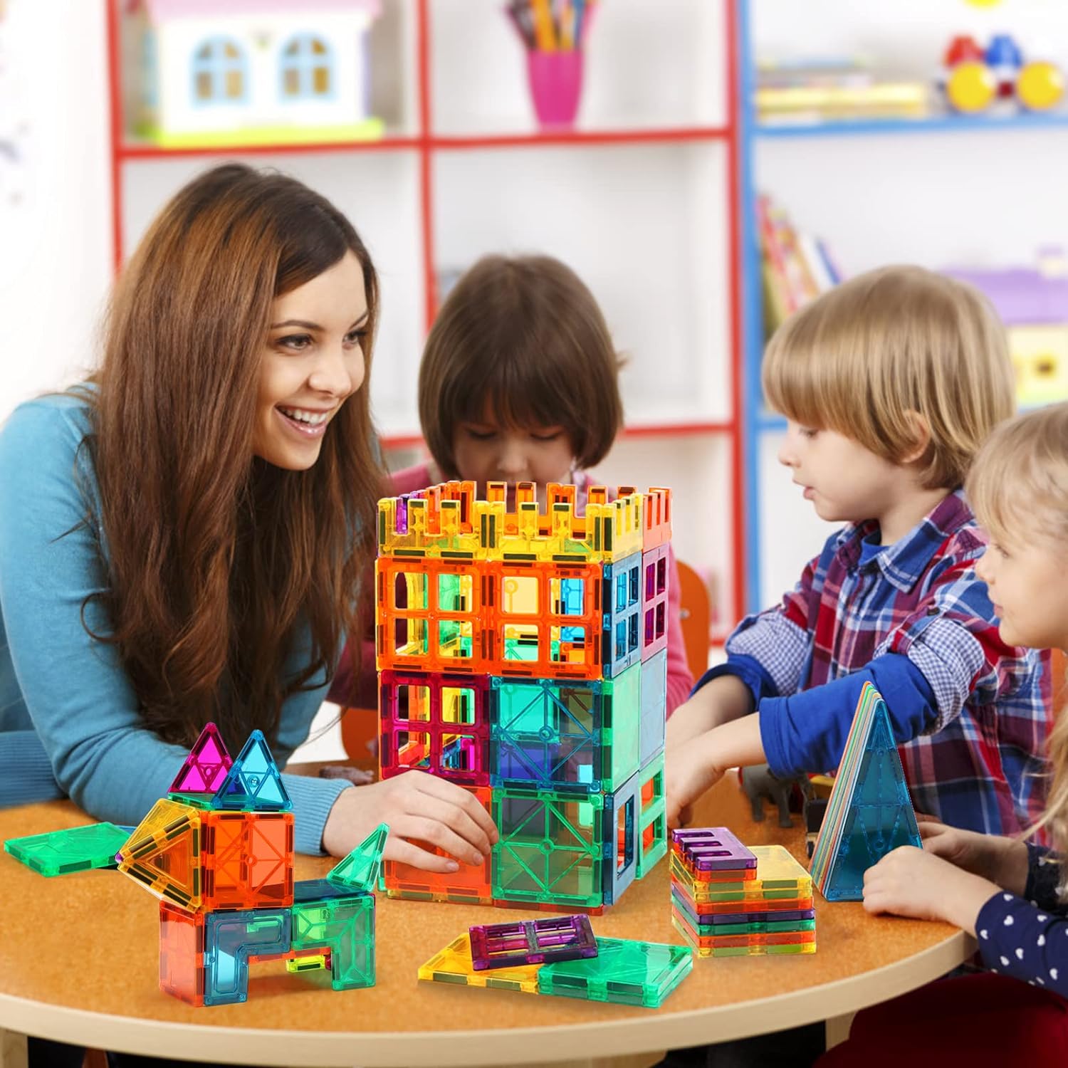 - STEM Approved Toy: Gemmicc Magnetic tiles set is perfect for classroom, family, kindergarten, day care centers etc. This toys set can help enhance your kids’ fine motor skills, color and shape recognition ability, Children can build anything they imagine, from 2D planar shapes to 3D geometry, your children will feel a sense of accomplishment during the play.